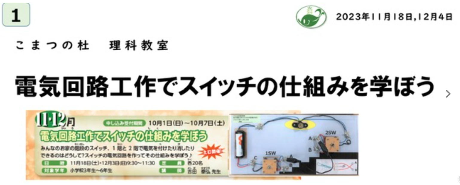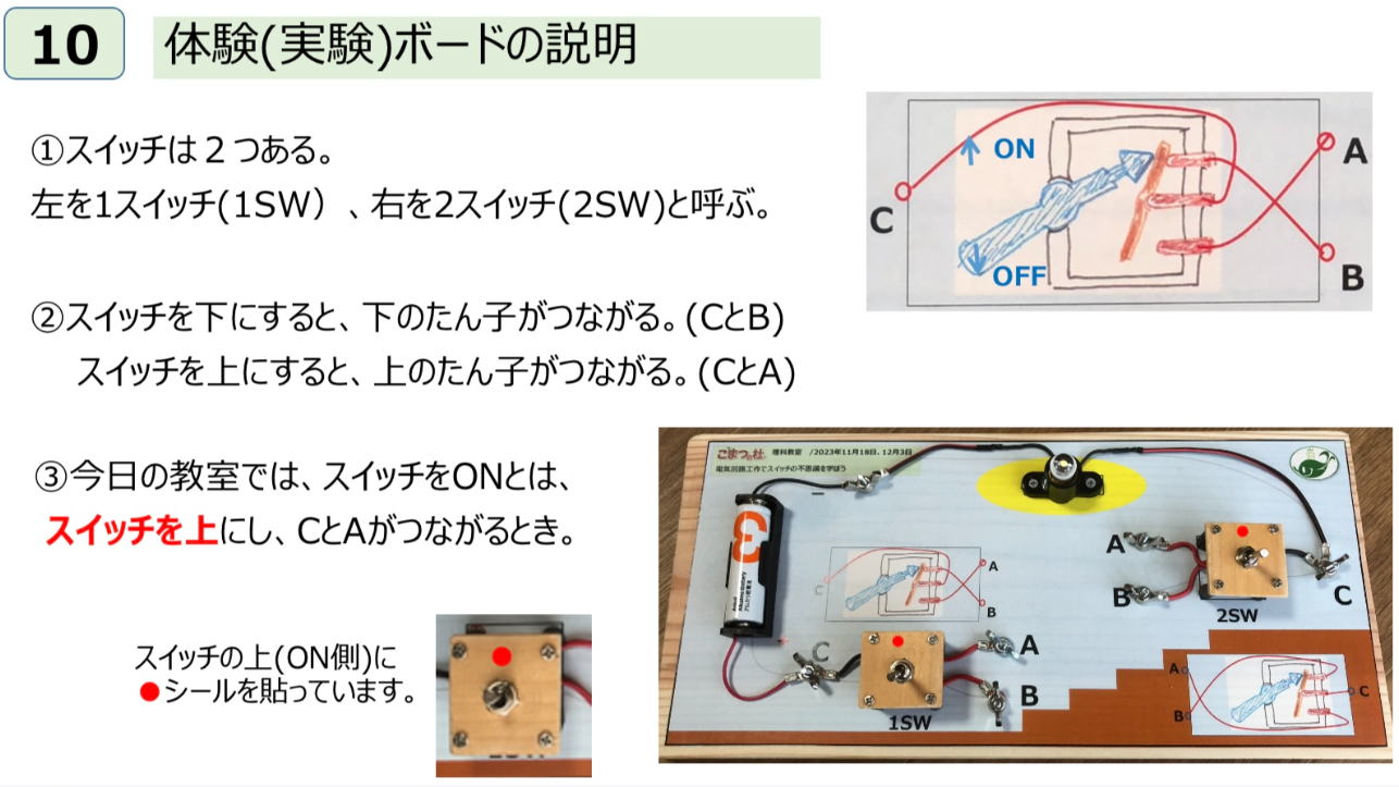 子供が工作で「電気回路接続体験ボード」をつくり、そのボードを使い回路接続の体験実習をするという教室にしました。