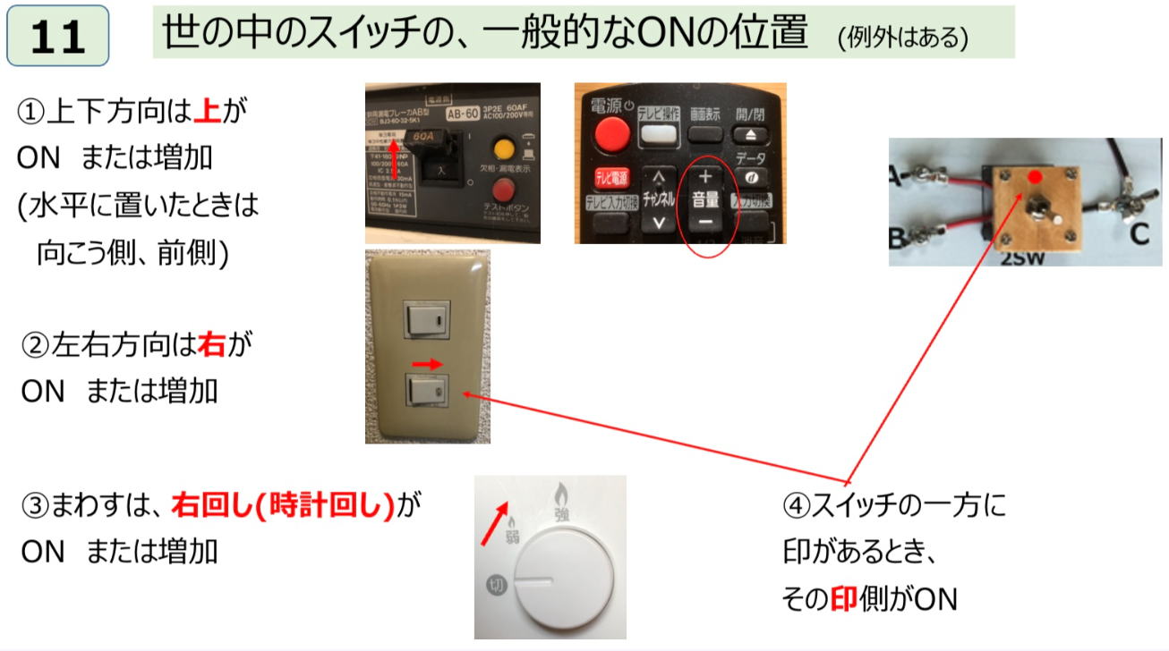 ◆11)スイッチを上をONとしたが、世の中のスイッチはONの方向が決まっている。またスイッチのどっちかに印があるときは、その印の方がON。例外はあると言うが家の中を見たけど例外はなかった。左右の事例の壁スイッチは、自分の家の洗面所で、下は照明で、上は換気扇。照明はスイッチで明かりが点くのでON/OFFはわかる。換気扇は音が微かなので、ON/OFFはどっちか戸惑う人は多いと思う。