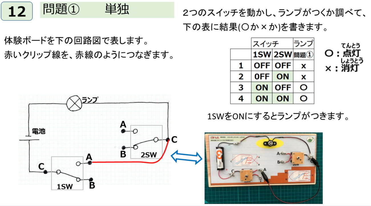 ◆12)電気回路接続の実験(体験)1 回路図の赤線通りにクリップ線を繋いで、2つのスイッチを操作してランプがつくかどうか調べて、結果を表に記録することを子供にやってもらった。(以下この説明省略)