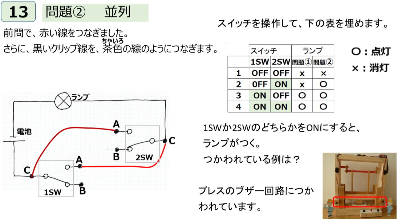 ◆13)体験2 1SWまたは2SWをONにすると点く。 プレスのブザーの実演と同じ回路。 「回路は、1SWとランプで輪ができるが、それと並んで2SWとランプでも輪ができる。ランプとしてはどっちの輪ができても点くので、1SWまたは2SWがONになると、ランプが点く。」