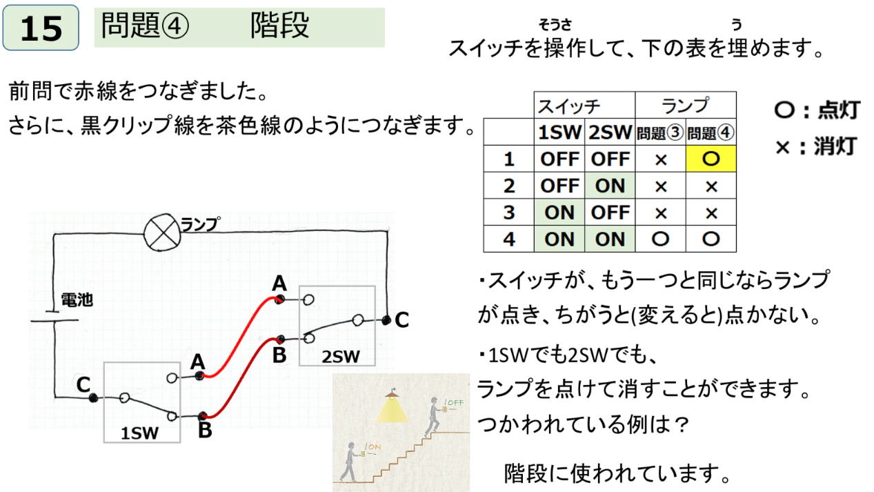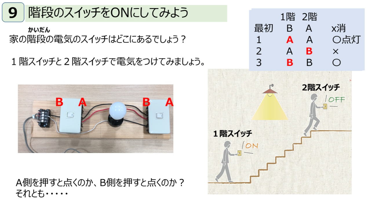 理科教室なので、実験風にスイッチの位置を見ながら操作してみる。子供一人にスイッチを押すことを協力してもらう。 最初は、1階スイッチ/2階スイッチはB/Aでx(消灯)。
