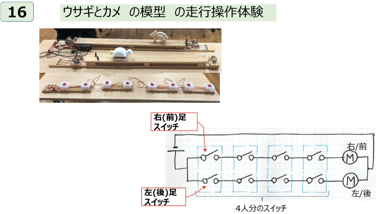 ◆16)4つのスイッチが1列に並んでモータを交互に動かす模型の操作体験。 詳細省略。