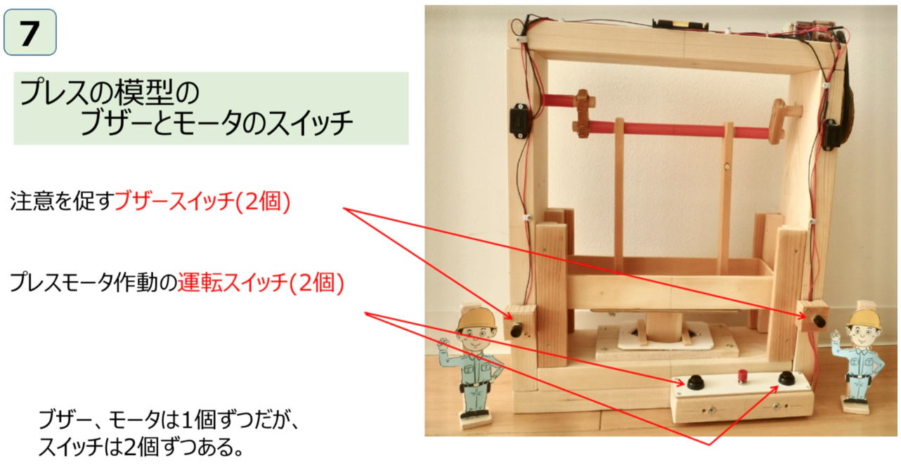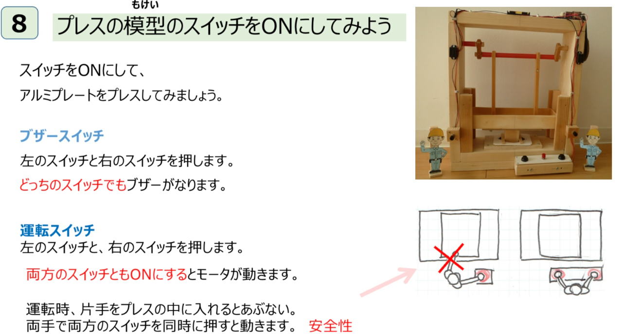 ◆7)プレスの模型でスイッチの実演をする。 このプレスの模型は、アルミ箔くらいだったら、型通り曲げることができる。合図のブザーが1個ありそのスイッチは左右に2個ある。動かすモータは1個あるがそのスイッチは操作盤に2個ある。